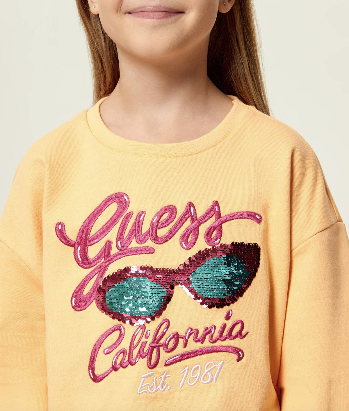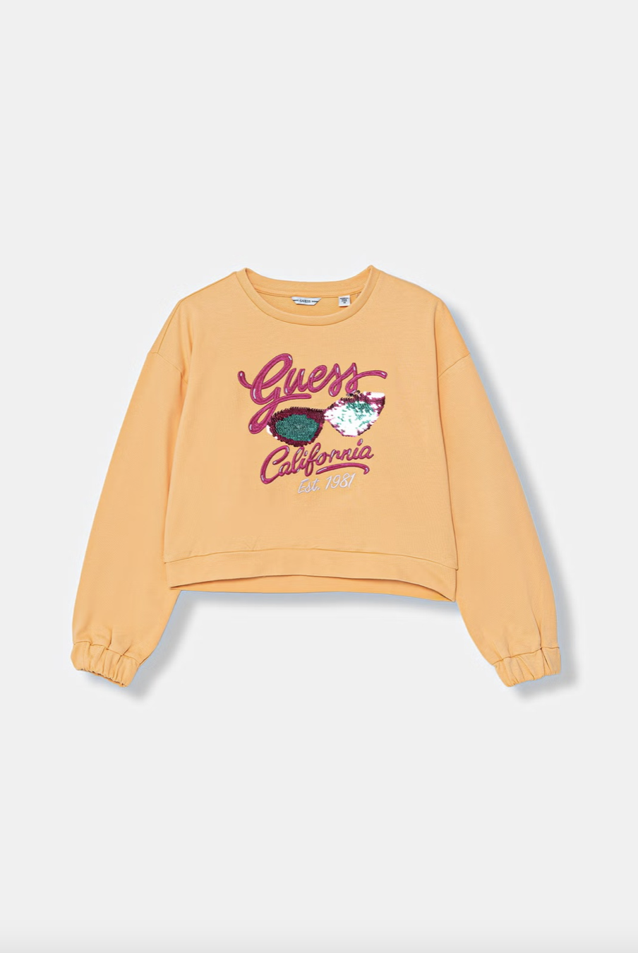 Bluza dziecięca z kolekcji Guess. Model wykonany z cienkiej, elastycznej dzianiny. Wysokogatunkowy, komfortowy materiał.